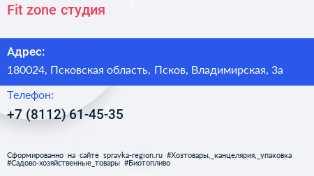 Fit zone, студия по адресу 180024, Псковская область, Псков, Владимирская, 3а в дальнейшем Организация, размещена в следующих категориях: