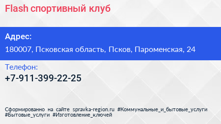 Flash, спортивный клуб по адресу 180007, Псковская область, Псков, Пароменская, 24 в дальнейшем Организация, размещена в следующих категориях: