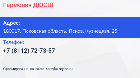 Гармония, ДЮСШ по адресу 180017, Псковская область, Псков, Кузнецкая, 25 в дальнейшем Организация, размещена в следующих категориях: