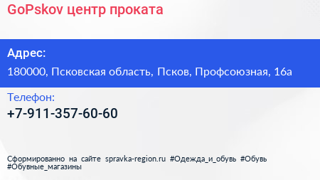 GoPskov, центр проката по адресу 180000, Псковская область, Псков, Профсоюзная, 16а в дальнейшем Организация, размещена в следующих категориях: