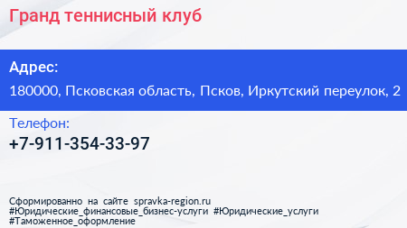 Гранд, теннисный клуб по адресу 180000, Псковская область, Псков, Иркутский переулок, 2 в дальнейшем Организация, размещена в следующих категориях: