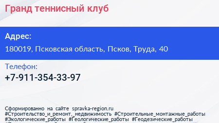 Гранд, теннисный клуб по адресу 180019, Псковская область, Псков, Труда, 40 в дальнейшем Организация, размещена в следующих категориях: