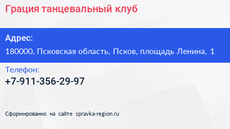 Грация, танцевальный клуб по адресу 180000, Псковская область, Псков, площадь Ленина, 1 в дальнейшем Организация, размещена в следующих категориях:
