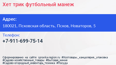 Хет-трик, футбольный манеж по адресу 180021, Псковская область, Псков, Новаторов, 5 в дальнейшем Организация, размещена в следующих категориях: