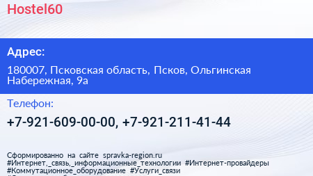 Hostel60 по адресу 180007, Псковская область, Псков, Ольгинская Набережная, 9а в дальнейшем Организация, размещена в следующих категориях: