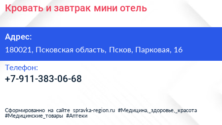 Кровать и завтрак, мини-отель по адресу 180021, Псковская область, Псков, Парковая, 16 в дальнейшем Организация, размещена в следующих категориях: