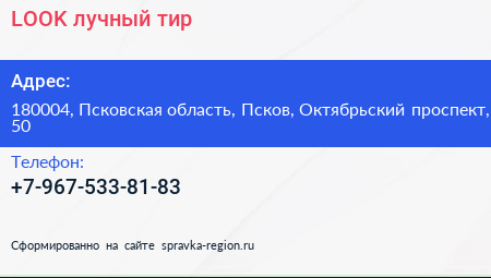 LOOK, лучный тир по адресу 180004, Псковская область, Псков, Октябрьский проспект, 50 в дальнейшем Организация, размещена в следующих категориях: