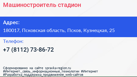 Машиностроитель, стадион по адресу 180017, Псковская область, Псков, Кузнецкая, 25 в дальнейшем Организация, размещена в следующих категориях:
