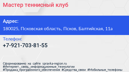 Мастер, теннисный клуб по адресу 180025, Псковская область, Псков, Балтийская, 11а в дальнейшем Организация, размещена в следующих категориях: