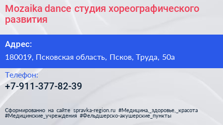 Mozaika dance, студия хореографического развития по адресу 180019, Псковская область, Псков, Труда, 50а в дальнейшем Организация, размещена в следующих категориях:
