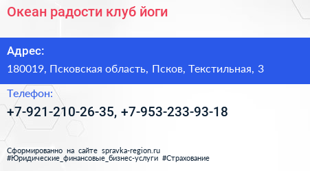 Океан радости, клуб йоги по адресу 180019, Псковская область, Псков, Текстильная, 3 в дальнейшем Организация, размещена в следующих категориях: