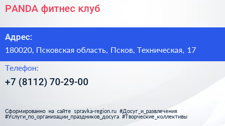 PANDA, фитнес-клуб по адресу 180020, Псковская область, Псков, Техническая, 17 в дальнейшем Организация, размещена в следующих категориях: