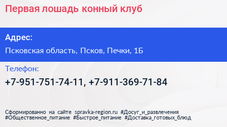 Первая лошадь, конный клуб по адресу Псковская область, Псков, Печки, 1Б в дальнейшем Организация, размещена в следующих категориях: