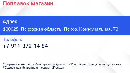 Поплавок, магазин по адресу 180025, Псковская область, Псков, Коммунальная, 73 в дальнейшем Организация, размещена в следующих категориях: