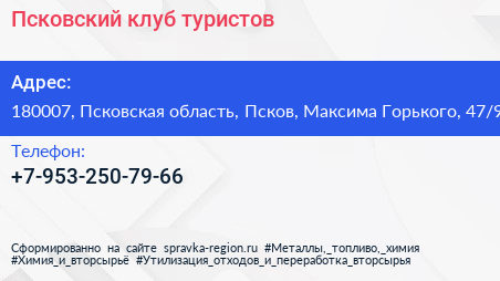 Псковский клуб туристов по адресу 180007, Псковская область, Псков, Максима Горького, 47/9 в дальнейшем Организация, размещена в следующих категориях: