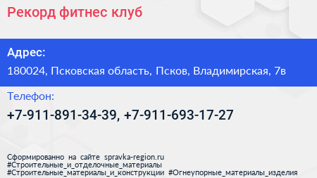 Рекорд, фитнес-клуб по адресу 180024, Псковская область, Псков, Владимирская, 7в в дальнейшем Организация, размещена в следующих категориях: