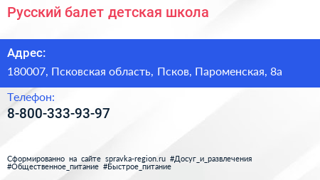 Русский балет, детская школа по адресу 180007, Псковская область, Псков, Пароменская, 8а в дальнейшем Организация, размещена в следующих категориях: