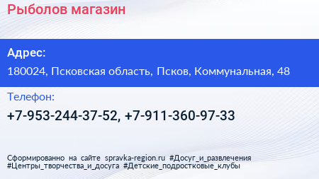 Рыболов, магазин по адресу 180024, Псковская область, Псков, Коммунальная, 48 в дальнейшем Организация, размещена в следующих категориях: