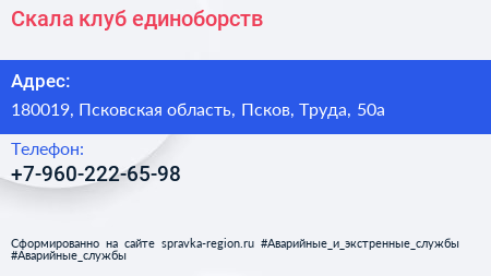Скала, клуб единоборств по адресу 180019, Псковская область, Псков, Труда, 50а в дальнейшем Организация, размещена в следующих категориях: