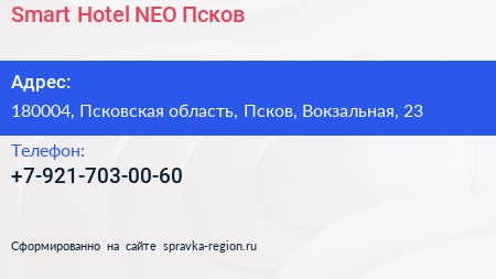 Smart Hotel NEO Псков по адресу 180004, Псковская область, Псков, Вокзальная, 23 в дальнейшем Организация, размещена в следующих категориях: