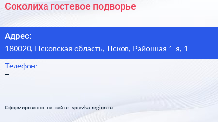 Соколиха, гостевое подворье по адресу 180020, Псковская область, Псков, Районная 1-я, 1 в дальнейшем Организация, размещена в следующих категориях: