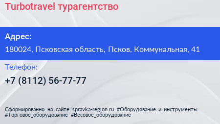 Turbotravel, турагентство по адресу 180024, Псковская область, Псков, Коммунальная, 41 в дальнейшем Организация, размещена в следующих категориях: