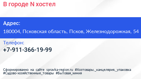 В городе N, хостел по адресу 180004, Псковская область, Псков, Железнодорожная, 54 в дальнейшем Организация, размещена в следующих категориях: