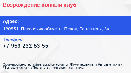 Возрождение, конный клуб по адресу 180551, Псковская область, Псков, Гецентова, 3а в дальнейшем Организация, размещена в следующих категориях: