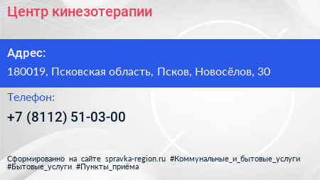 Центр кинезотерапии по адресу 180019, Псковская область, Псков, Новосёлов, 30 в дальнейшем Организация, размещена в следующих категориях: