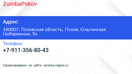 #ZumbaPskov по адресу 180007, Псковская область, Псков, Ольгинская Набережная, 9а в дальнейшем Организация, размещена в следующих категориях: