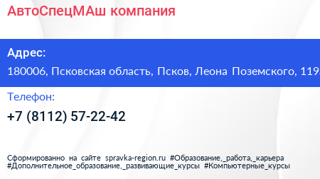 АвтоСпецМАш, компания по адресу 180006, Псковская область, Псков, Леона Поземского, 119а в дальнейшем Организация, размещена в следующих категориях: