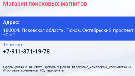 Магазин поисковых магнитов по адресу 180004, Псковская область, Псков, Октябрьский проспект, 50 к1 в дальнейшем Организация, размещена в следующих категориях: