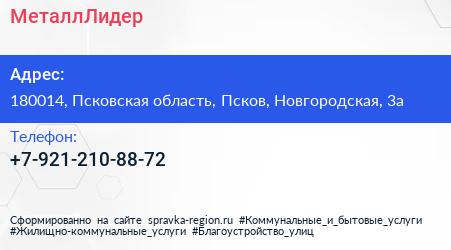 МеталлЛидер по адресу 180014, Псковская область, Псков, Новгородская, 3а в дальнейшем Организация, размещена в следующих категориях: