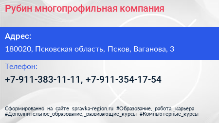 Рубин, многопрофильная компания по адресу 180020, Псковская область, Псков, Ваганова, 3 в дальнейшем Организация, размещена в следующих категориях: