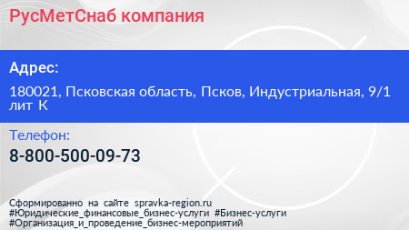 РусМетСнаб, компания по адресу 180021, Псковская область, Псков, Индустриальная, 9/1 лит К в дальнейшем Организация, размещена в следующих категориях: