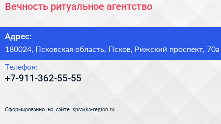 Вечность, ритуальное агентство по адресу 180024, Псковская область, Псков, Рижский проспект, 70а в дальнейшем Организация, размещена в следующих категориях: