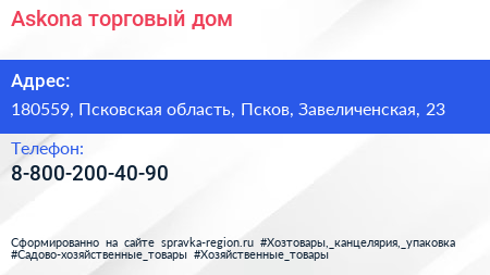 Askona, торговый дом по адресу 180559, Псковская область, Псков, Завеличенская, 23 в дальнейшем Организация, размещена в следующих категориях: