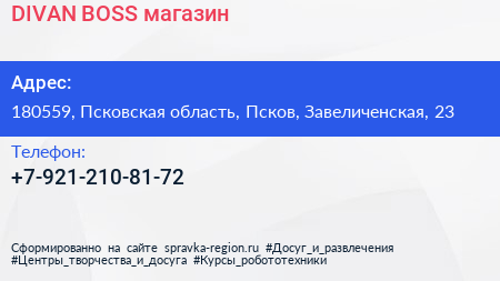 DIVAN BOSS, магазин по адресу 180559, Псковская область, Псков, Завеличенская, 23 в дальнейшем Организация, размещена в следующих категориях: