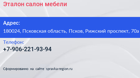Эталон, салон мебели по адресу 180024, Псковская область, Псков, Рижский проспект, 70а в дальнейшем Организация, размещена в следующих категориях: