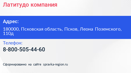 Латитудо, компания по адресу 180000, Псковская область, Псков, Леона Поземского, 110д в дальнейшем Организация, размещена в следующих категориях:
