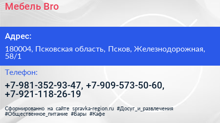 Мебель Bro по адресу 180004, Псковская область, Псков, Железнодорожная, 58/1 в дальнейшем Организация, размещена в следующих категориях: