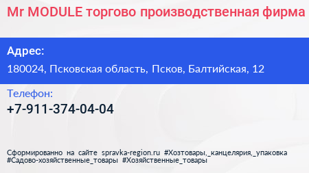 Mr.MODULE, торгово-производственная фирма по адресу 180024, Псковская область, Псков, Балтийская, 12 в дальнейшем Организация, размещена в следующих категориях: