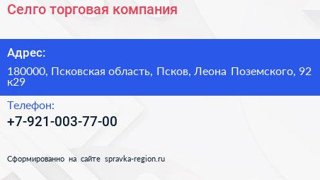 Селго, торговая компания по адресу 180000, Псковская область, Псков, Леона Поземского, 92 к29 в дальнейшем Организация, размещена в следующих категориях: