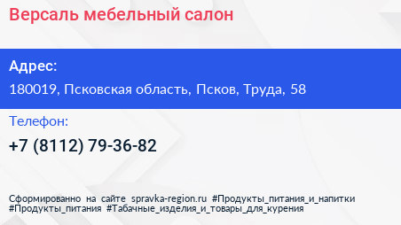 Версаль, мебельный салон по адресу 180019, Псковская область, Псков, Труда, 58 в дальнейшем Организация, размещена в следующих категориях: