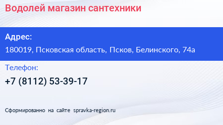 Водолей, магазин сантехники по адресу 180019, Псковская область, Псков, Белинского, 74а в дальнейшем Организация, размещена в следующих категориях: