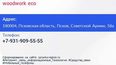 woodwork.eco по адресу 180004, Псковская область, Псков, Советской Армии, 58а в дальнейшем Организация, размещена в следующих категориях: