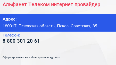 Альфанет Телеком, интернет-провайдер по адресу 180017, Псковская область, Псков, Советская, 85 в дальнейшем Организация, размещена в следующих категориях: