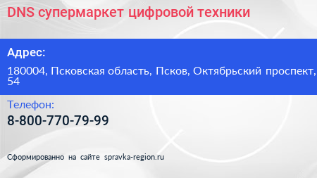 DNS, супермаркет цифровой техники по адресу 180004, Псковская область, Псков, Октябрьский проспект, 54 в дальнейшем Организация, размещена в следующих категориях: