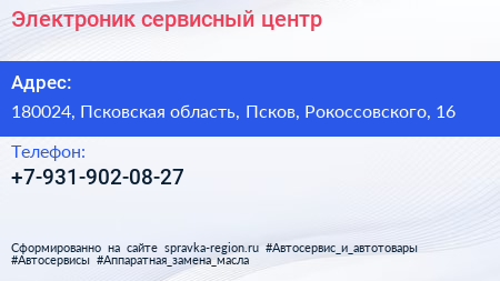 Электроник, сервисный центр по адресу 180024, Псковская область, Псков, Рокоссовского, 16 в дальнейшем Организация, размещена в следующих категориях: