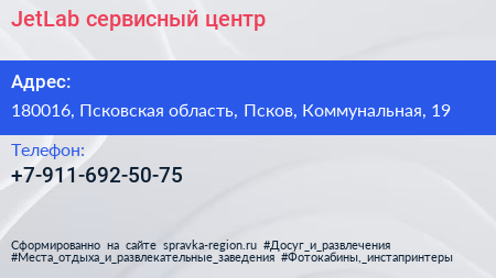 JetLab, сервисный центр по адресу 180016, Псковская область, Псков, Коммунальная, 19 в дальнейшем Организация, размещена в следующих категориях: